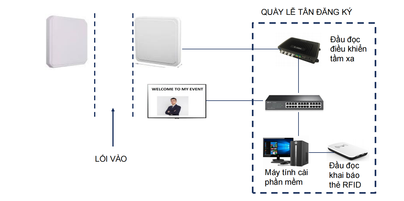 - Bước 4: Khách hàng vào khu vực sự kiện (qua cổng RFID), hệ thống ghi nhận diện dữ liệu thông tin khách hàng, hiển thị thông tin xin chào, hình ảnh…khách hàng trên màn hình điện tử