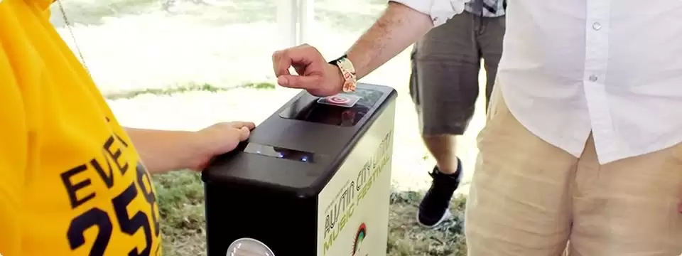 - Vòng tay RFID: Đây là linh hồn của hệ thống. Trên mỗi vòng tay sẽ được tích hợp một chip RFID chứa đựng thông tin cá nhân của khách hàng như tên, mã số, đơn vị, loại vé… Khi đến sự kiện, khách chỉ cần đeo vòng tay RFID này lên tay sau đó đi qua cổng đầu đọc.